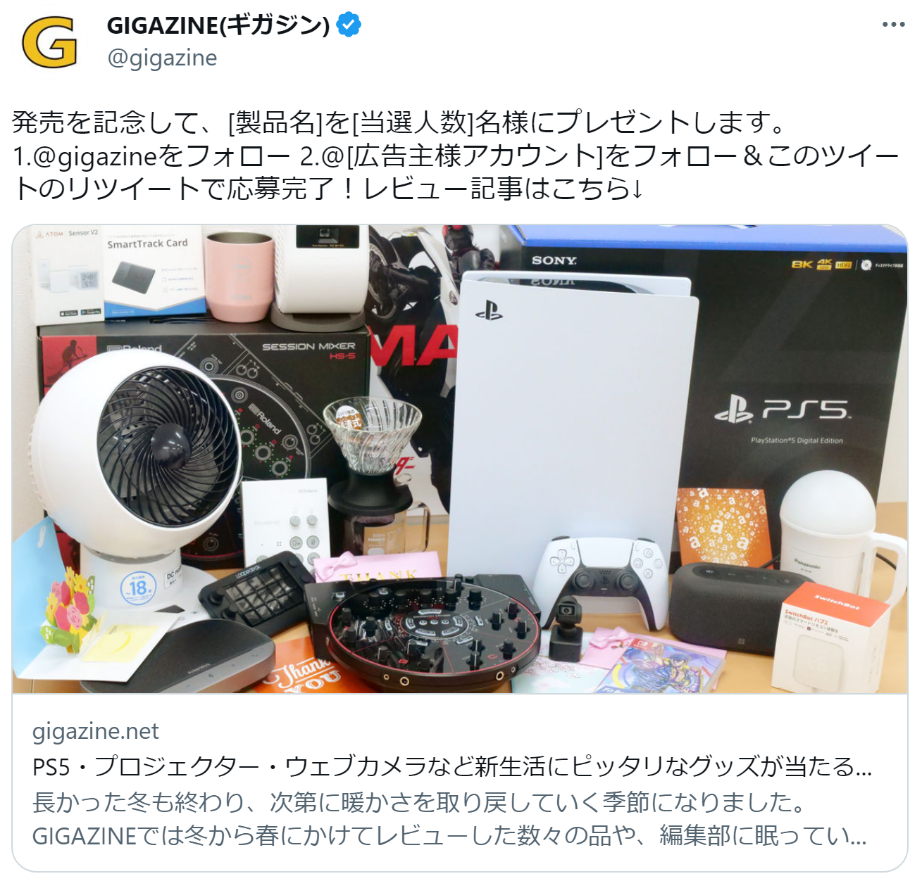GIGAZINEに記事広告が掲載されると、以下のGIGAZINE公式アカウントから投稿されます。