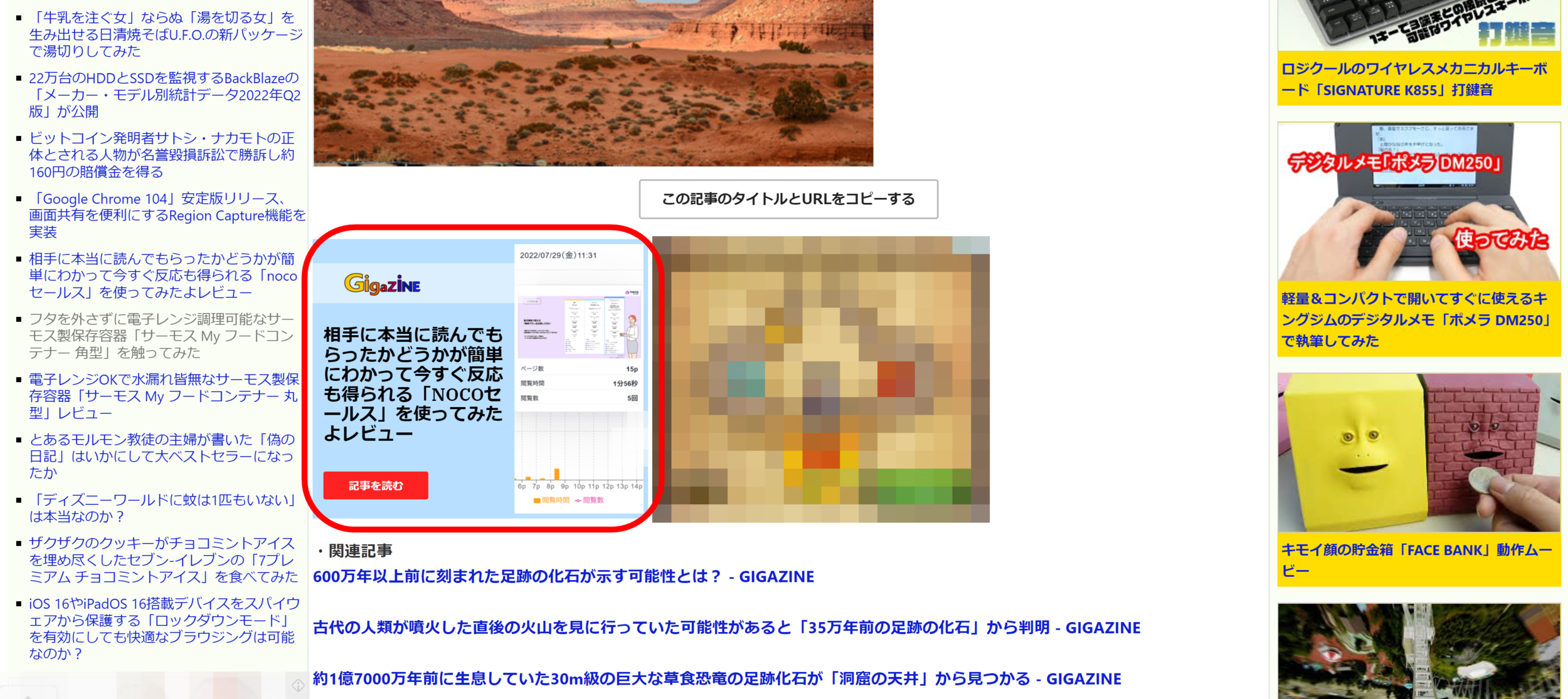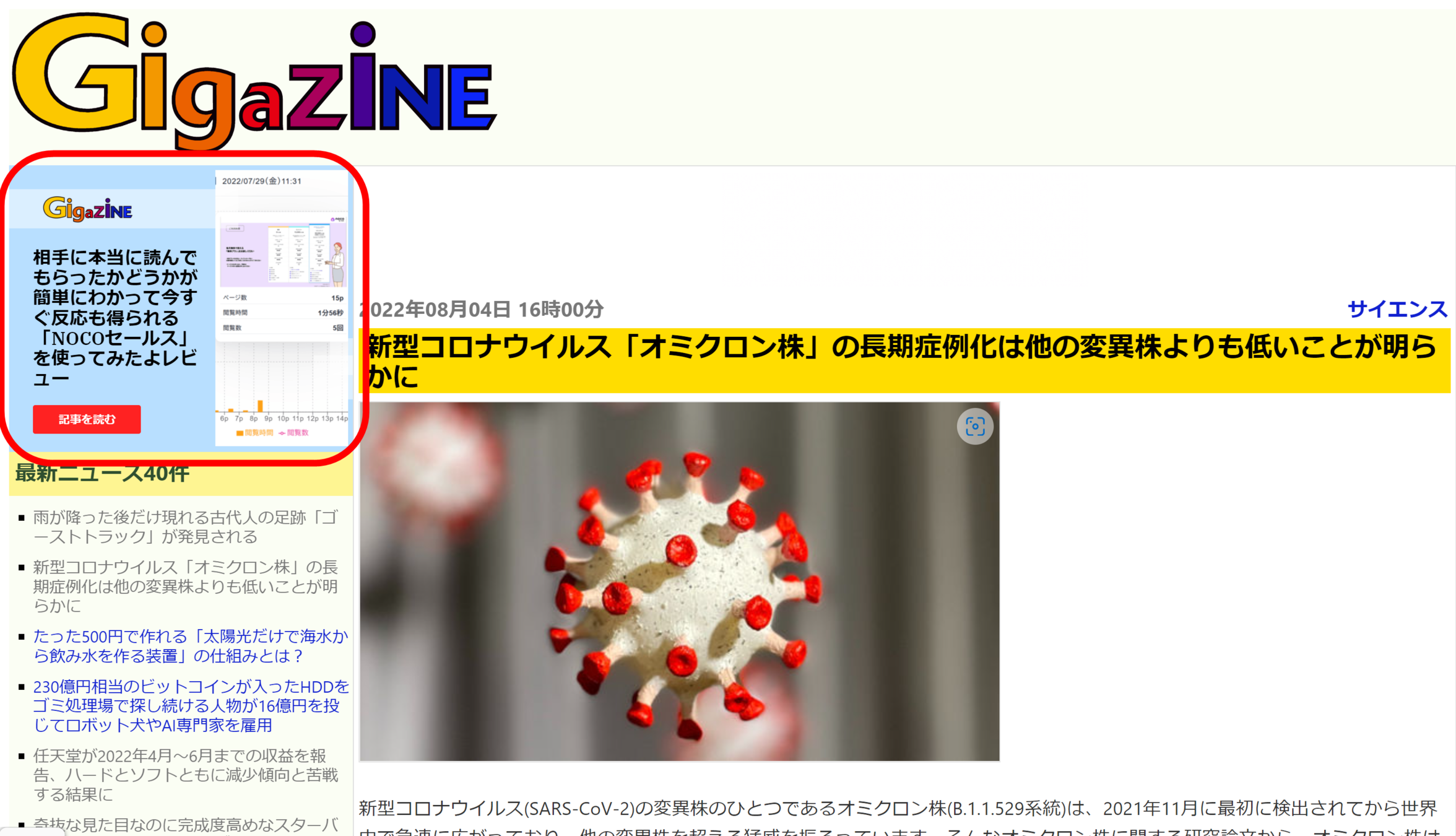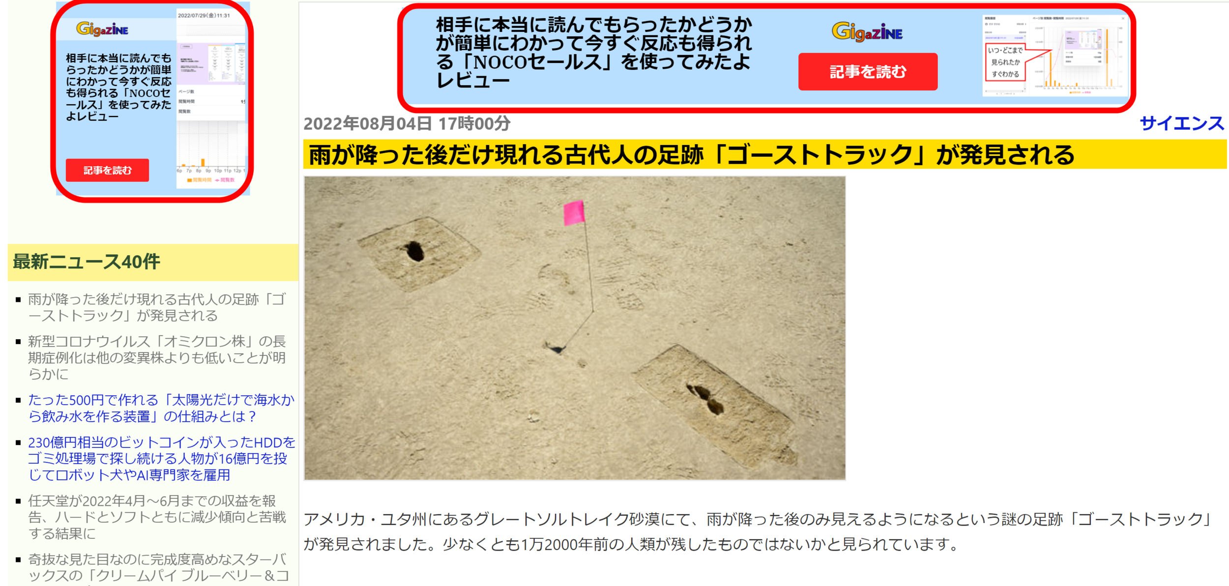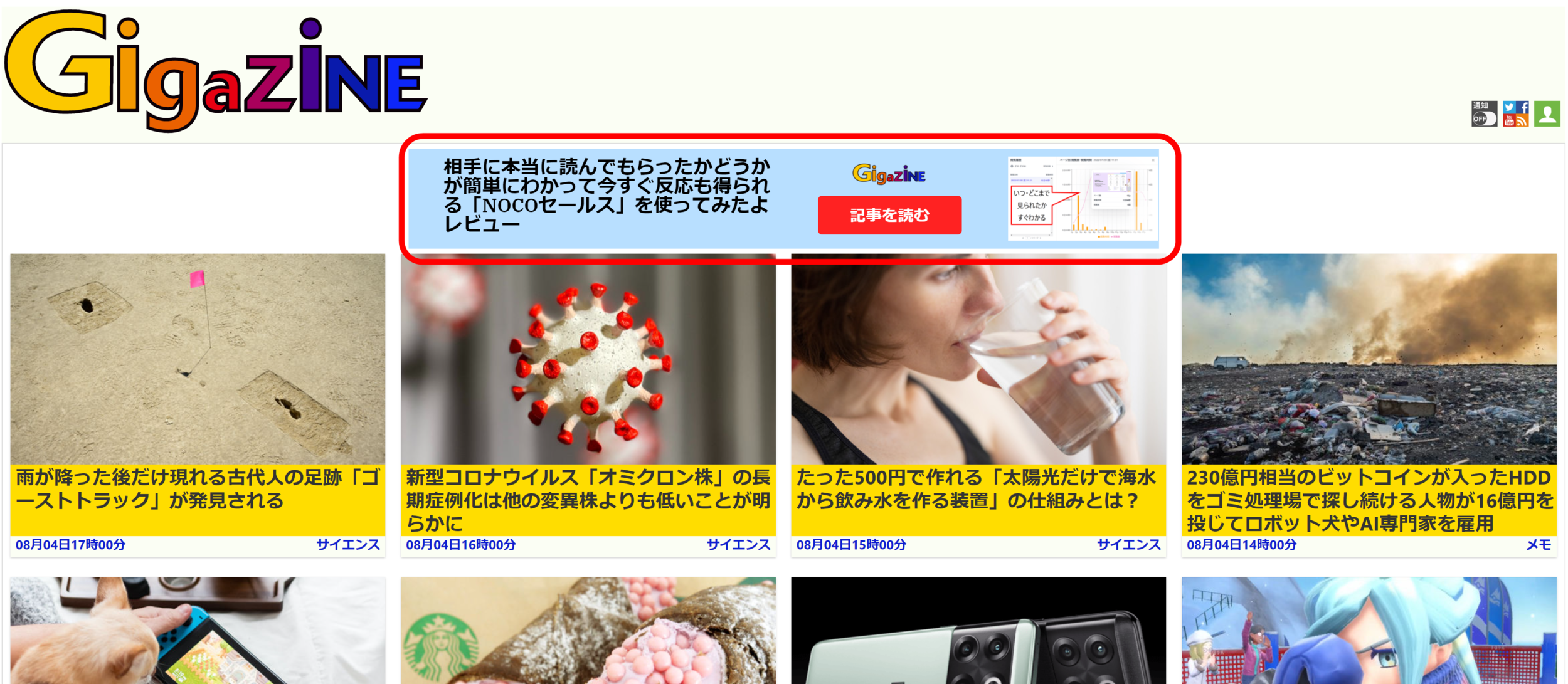 前ページの各誘導に加え、β版サービスとして無料でGIGAZINE内にある全広告枠へ、掲載日から1週間、記事広告への誘導バナーをランダムに配信しています。