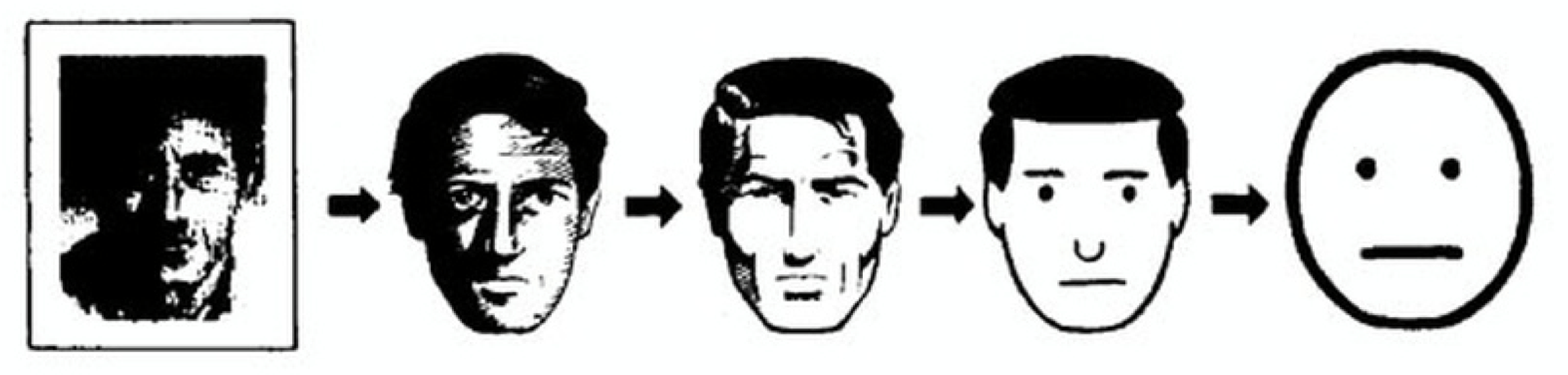 Se reconocen, formalmente, 11 grados de iconicidad, que van desde la imagen al natural de algo hasta una representación no figurativa de el objeto