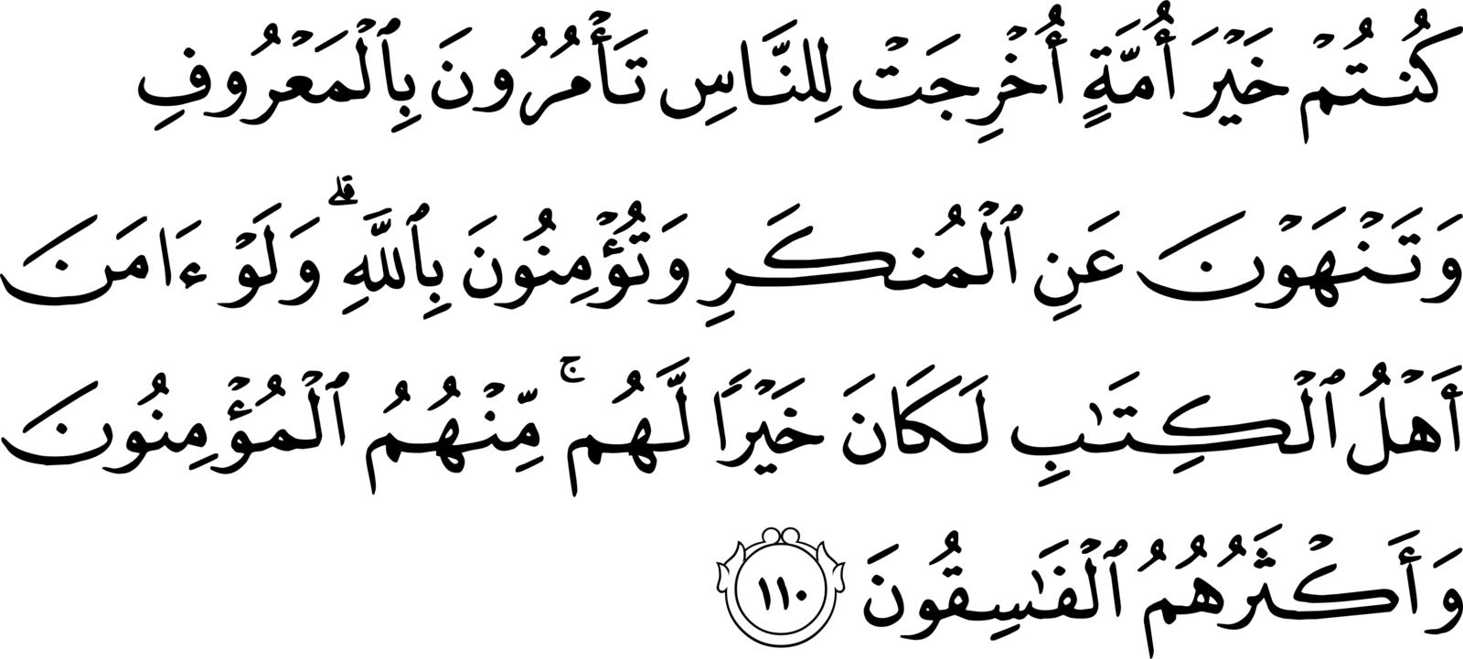 “Ye are the best community that hath been raised up for mankind. Ye enjoin right conduct and forbid indecency; and ye believe in Allah. And if the People of the Scripture had believed it had been better for them. Some of them are believers; but most of them are evil-livers.”