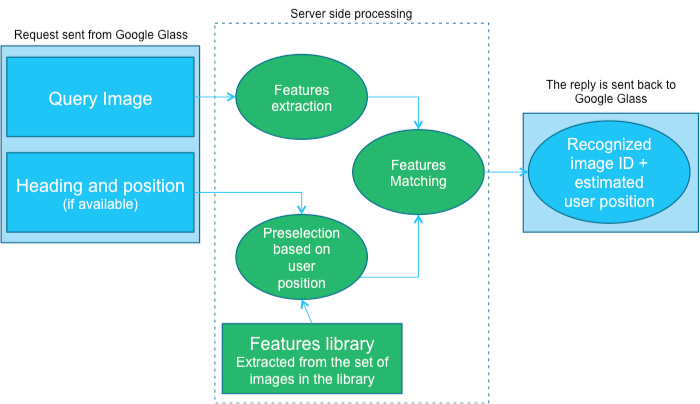 User position and what the user is looking at are determined through the SURF image recognition algorithm from the OpenCV library.