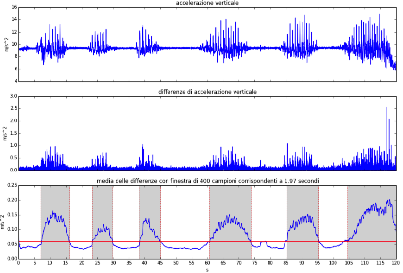 key point: a variation of accelerations which persists in time for a good part of the temporal observation window provides a good “suggestion” to suppose several subsequent steps, therefore we can assume that the user is walking.