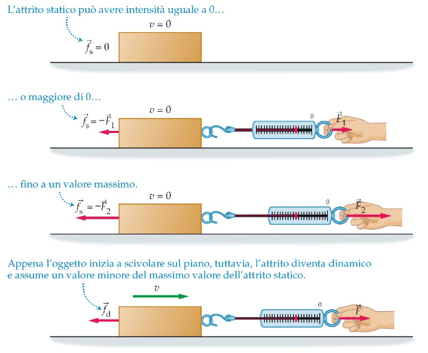 attrito statico: se proviamo a muovere un oggetto che è a contatto con una superficie, l’effetto della forza applicata non è immediato, perchè prima dobbiamo “smuoverlo”;