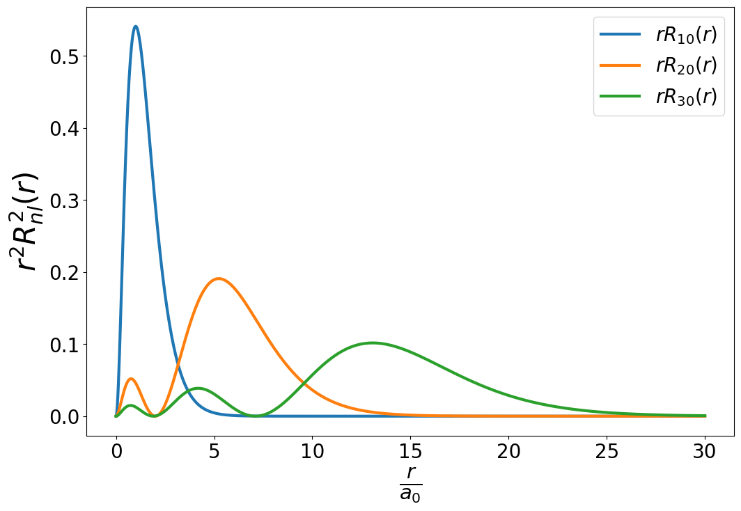R_{nl}(r) = \sqrt{\bigg(\frac{2}{n}\bigg)^3 \frac{(n-l-1)!}{2n(n+l)!}} \bigg(\frac{r}{n a_0}\bigg)^l e^{-\frac{r}{n a_0}} L_{n-l-1}^{2l+1}\bigg(\frac{2r}{n a_0}\bigg),