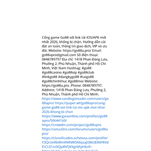 Website: https://go88a.prohttps://go88a.pro Cổng game Go88 với link tải IOS/APK mới nhất 2026, không bị chặn. Hướng dẫn cài đặt an toàn, thông tin giao dịch, VIP và ưu đãi. Website: https://go88a.pro/ Email: go88apro@gmail.com Số điện thoại: 0848789797 Địa chỉ: 141