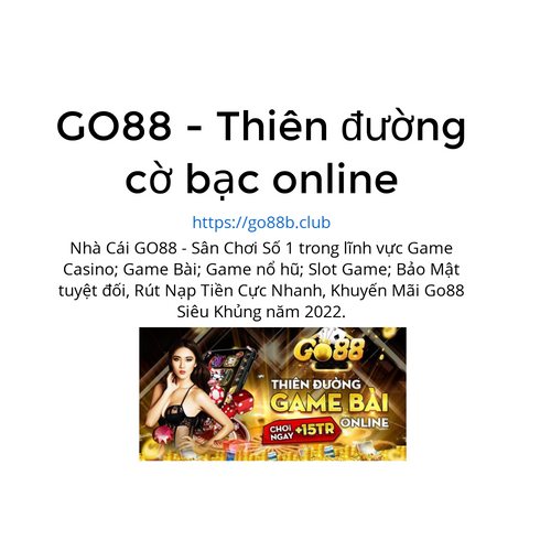Nhà Cái GO88 - Sân Chơi Số 1 trong lĩnh vực Game Casino; Game Bài; Game nổ hũ; Slot Game; Bảo Mật tuyệt đối, Rút Nạp Tiền Cực Nhanh, Khuyến Mãi Go88 Siêu Khủng năm 2022. Go88 là cổng game bài đổi thưởng, thuộc một trong những ông lớn trong mảng giải trí trực tuyến dành cho mọi người. Ban đầu chỉ phát hành các sản phẩm liên quan đến nổ hũ nhưng nhận thấy tên tuổi của mình ngày càng được đón nhận nồng nhiệt, Go88 Club đã không ngần ngại giới thiệu các thể loại giải trí quen thuộc khác như game bài, mini game, cá cược. thể thao… #nhacaigo88b #gamebaigo88 #go88 Thông tin liên hệ: Website: https://go88b.club Email: go88bclub@gmail.com Địa chỉ: Phường Hiệp Bình Chánh, TP.Thủ Đức, TP.HCM
