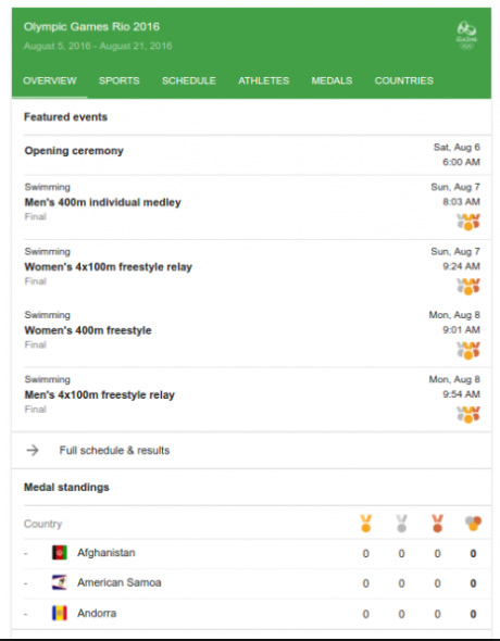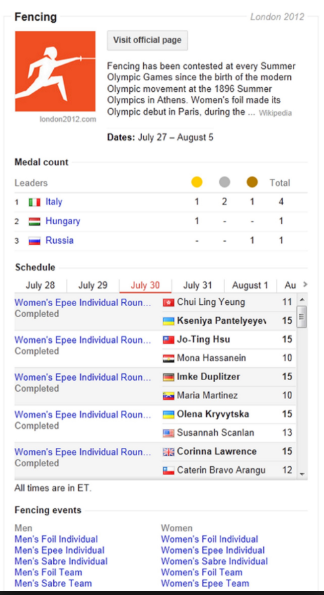 - Obtener eventos organizados en función de las respectivas categorías para cada disciplina, clasificados cronológicamente.