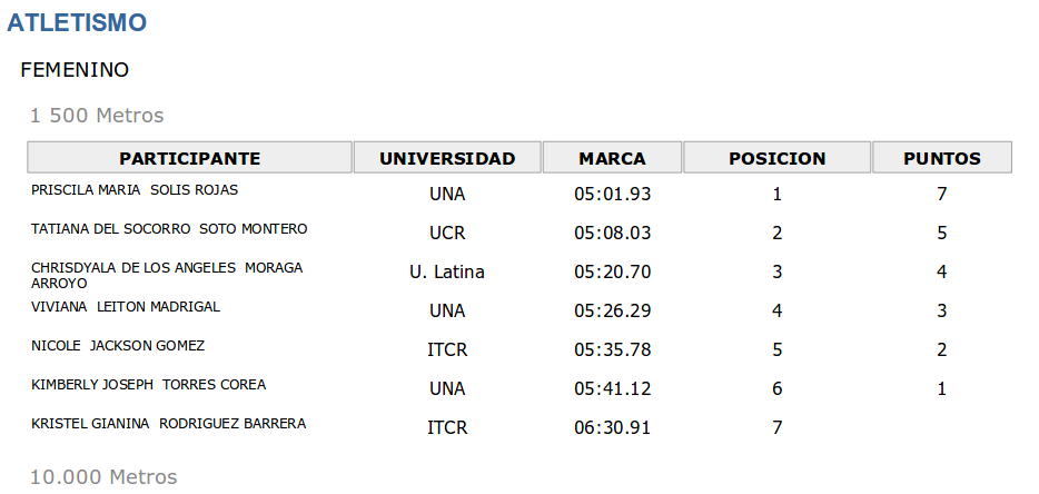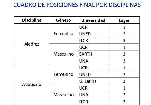 - Detalle de las estadísticas generales para disciplina organizadas por su respectiva categoría.