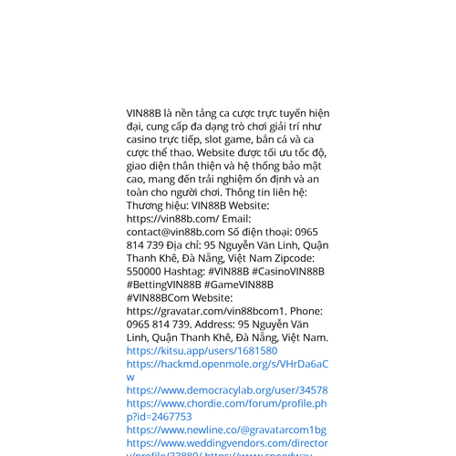 Website: https://gravatar.com/vin88bcom1https://gravatar.com/vin88bcom1 VIN88B là nền tảng ca cược trực tuyến hiện đại, cung cấp đa dạng trò chơi giải trí như casino trực tiếp, slot game, bắn cá và ca cược thể thao. Website được tối ưu tốc độ, giao diện thân thiện và hệ thống bảo