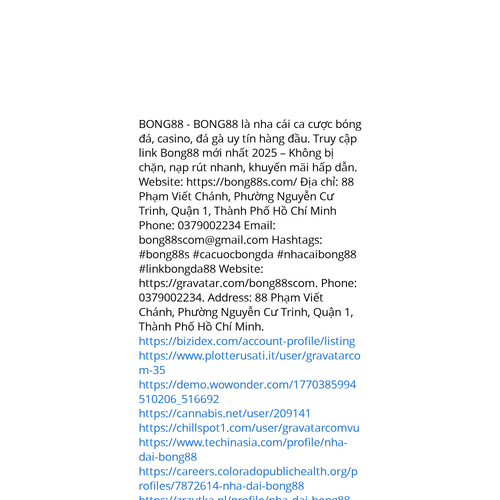 Website: https://gravatar.com/bong88scom. BONG88 - BONG88 là nha cái ca cược bóng đá, casino, đá gà uy tín hàng đầu. Truy cập link Bong88 mới nhất 2025 – Không bị chặn, nạp rút nhanh, khuyến mãi hấp dẫn. Website: https://bong88s.com/ Địa chỉ: 88 Phạ