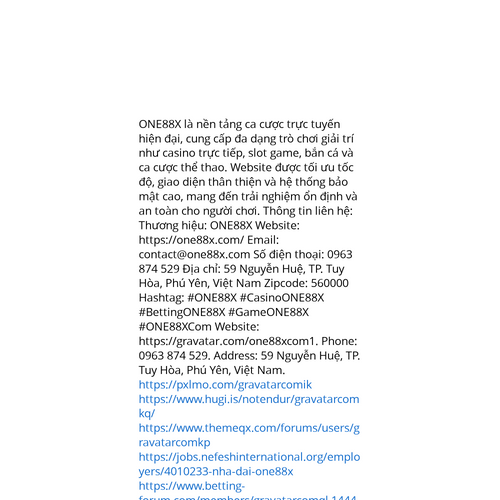 Website: https://gravatar.com/one88xcom1. ONE88X là nền tảng ca cược trực tuyến hiện đại, cung cấp đa dạng trò chơi giải trí như casino trực tiếp, slot game, bắn cá và ca cược thể thao. Website được tối ưu tốc độ, giao diện thân thiện và hệ thống bảo