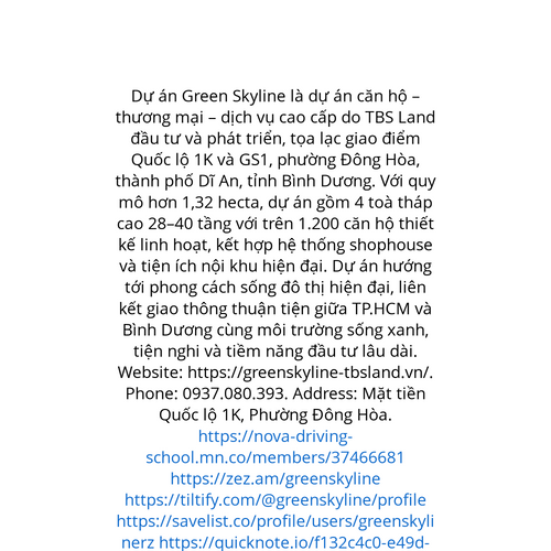 Website: https://greenskyline-tbsland.vn/. Dự án Green Skyline là dự án căn hộ – thương mại – dịch vụ cao cấp do TBS Land phát triển, nằm tại vị trí ngã ba Quốc lộ 1K & GS1, phường Đông Hòa, TP. Dĩ An, Bình Dương. Trên quỹ đất hơn 1,32 ha, dự án