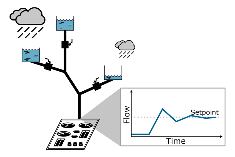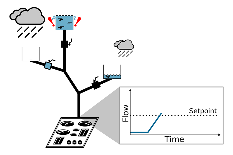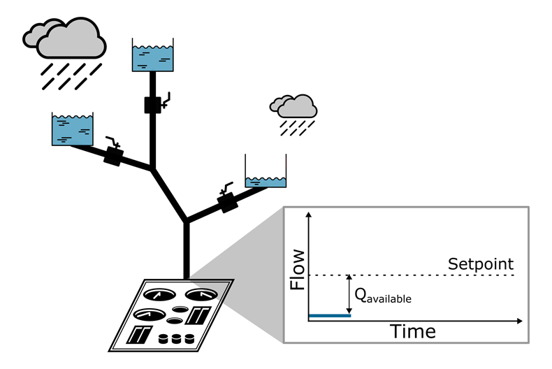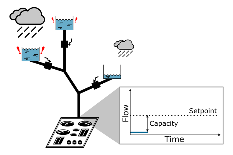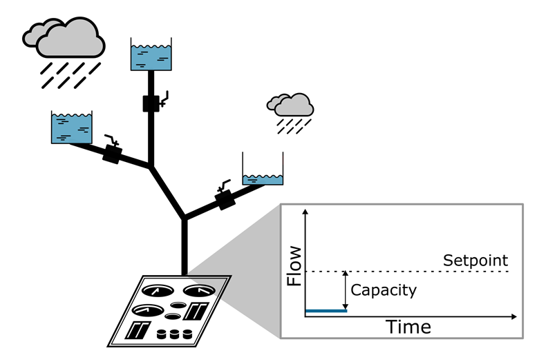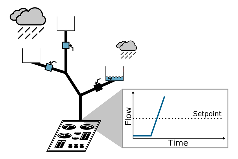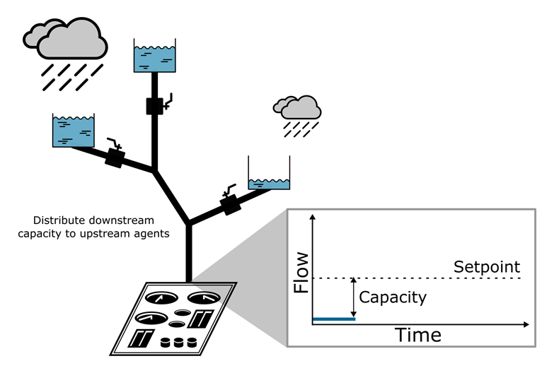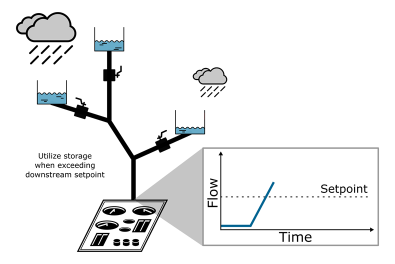 Repeating this process continuously throughout a wet-weather event will nudge downstream to its objective, while utilizing upstream storage maximally