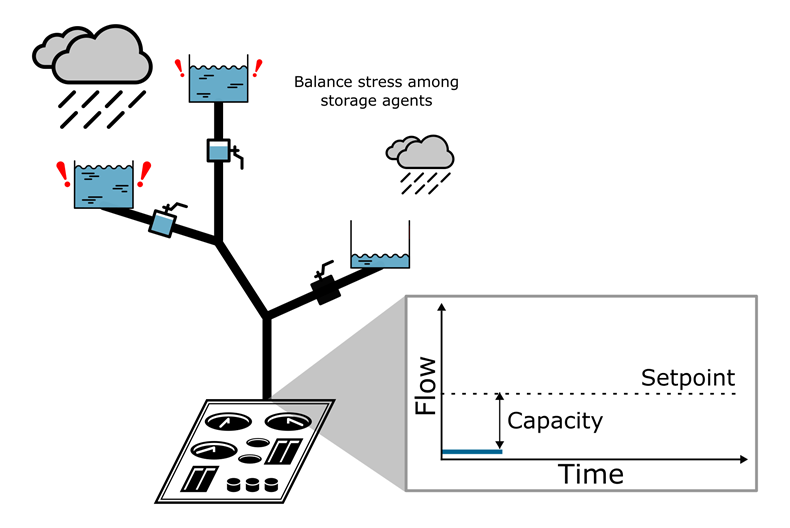 As storages fill, stress increases. We seek to distribute downstream capacity among upstream storages based on their stress.