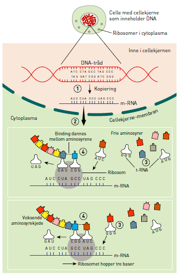 - m-RNA-molekylet sendes ut i cytoplasma og legger seg på et ribosom. Har dannes aminosyren. DNA blir værende i kjernen.