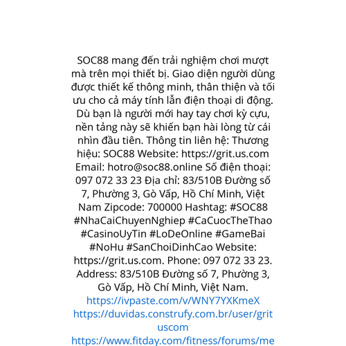 Website: https://grit.us.com. SOC88 mang đến trải nghiệm chơi mượt mà trên mọi thiết bị. Giao diện người dùng được thiết kế thông minh, thân thiện và tối ưu cho cả máy tính lẫn điện thoại di động. Dù bạn là người mới hay tay chơi kỳ cựu, nền tảng này