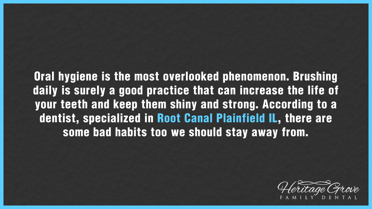 Oral hygiene is the most overlooked phenomenon. Brushing daily is surely a good practice that can increase the life of your teeth and keep them shiny and strong. According to a dentist, specialized in Root Canal Plainfield IL, there are some bad habits too we should stay away from. http://www.heritagegrovefamilydental.com/services.html