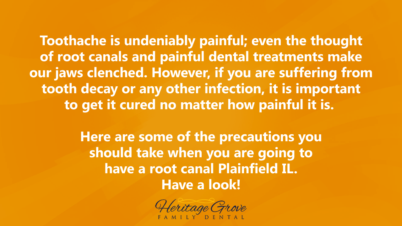 Toothache is undeniably painful; even the thought of root canals and painful dental treatments make our jaws clenched. However, if you are suffering from tooth decay or any other infection, it is important to get it cured no matter how painful it is. Here are some of the precautions you should take when you are going to have a root canal Plainfield IL. Have a look! http://www.heritagegrovefamilydental.com/services.html