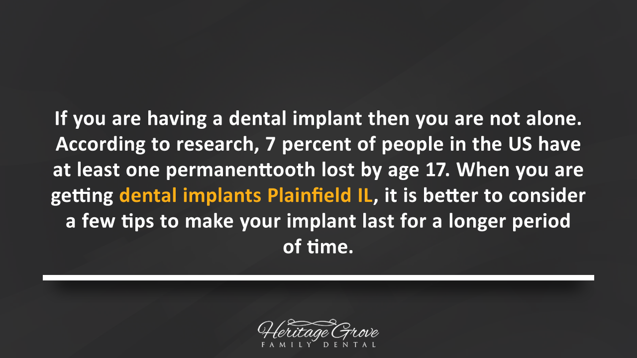 If you are having a dental implant then you are not alone. According to research, 7 percent of people in the US have at least one permanent tooth lost by age 17. When you are getting dental implants Plainfield IL, it is better to consider a few tips to make your implant last for a longer period of time. http://www.heritagegrovefamilydental.com/library/7782/ImplantDentistry.html