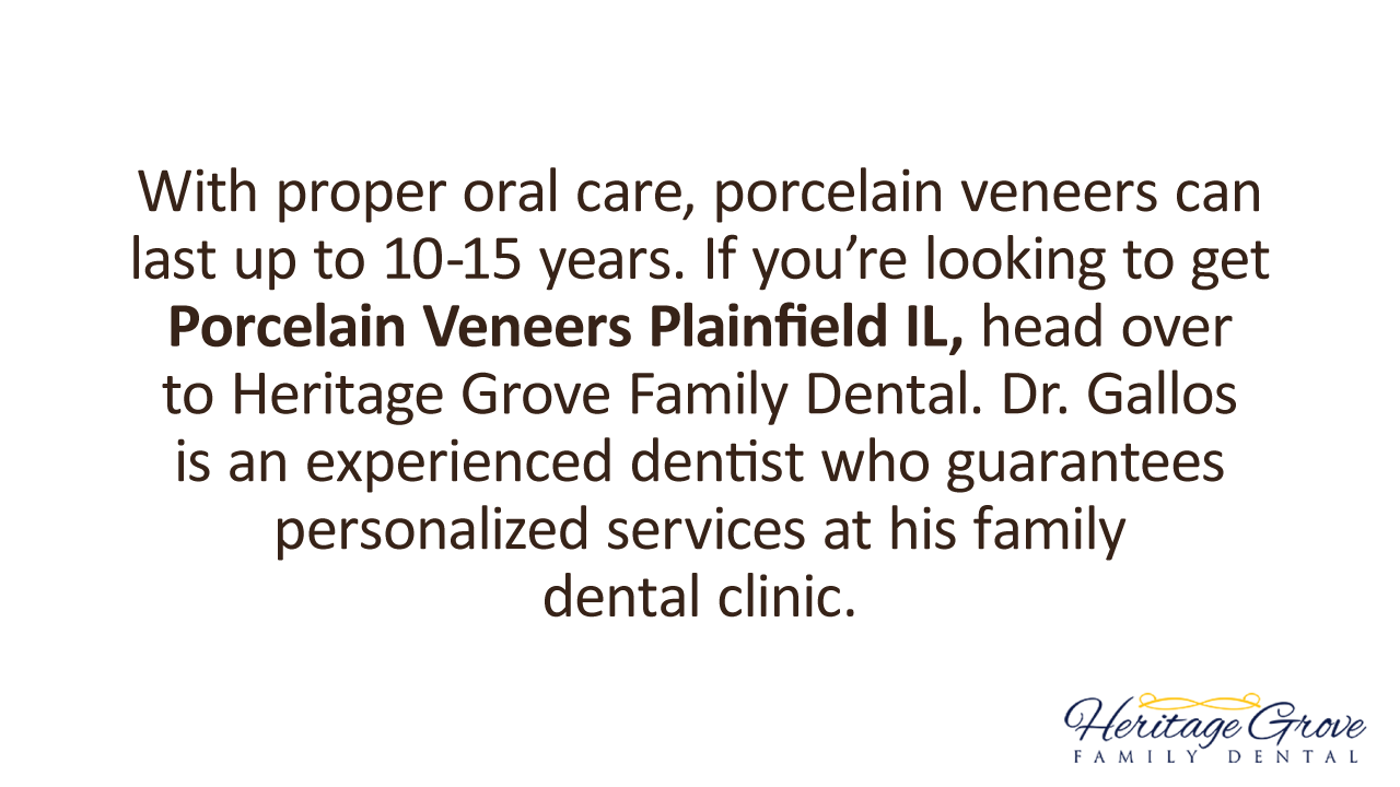 With proper oral care, porcelain veneers can last up to 10-15 years. If you’re looking to get porcelain veneers Plainfield IL, head over to Heritage Grove Family Dental. https://www.heritagegrovefamilydental.com/patients.html
