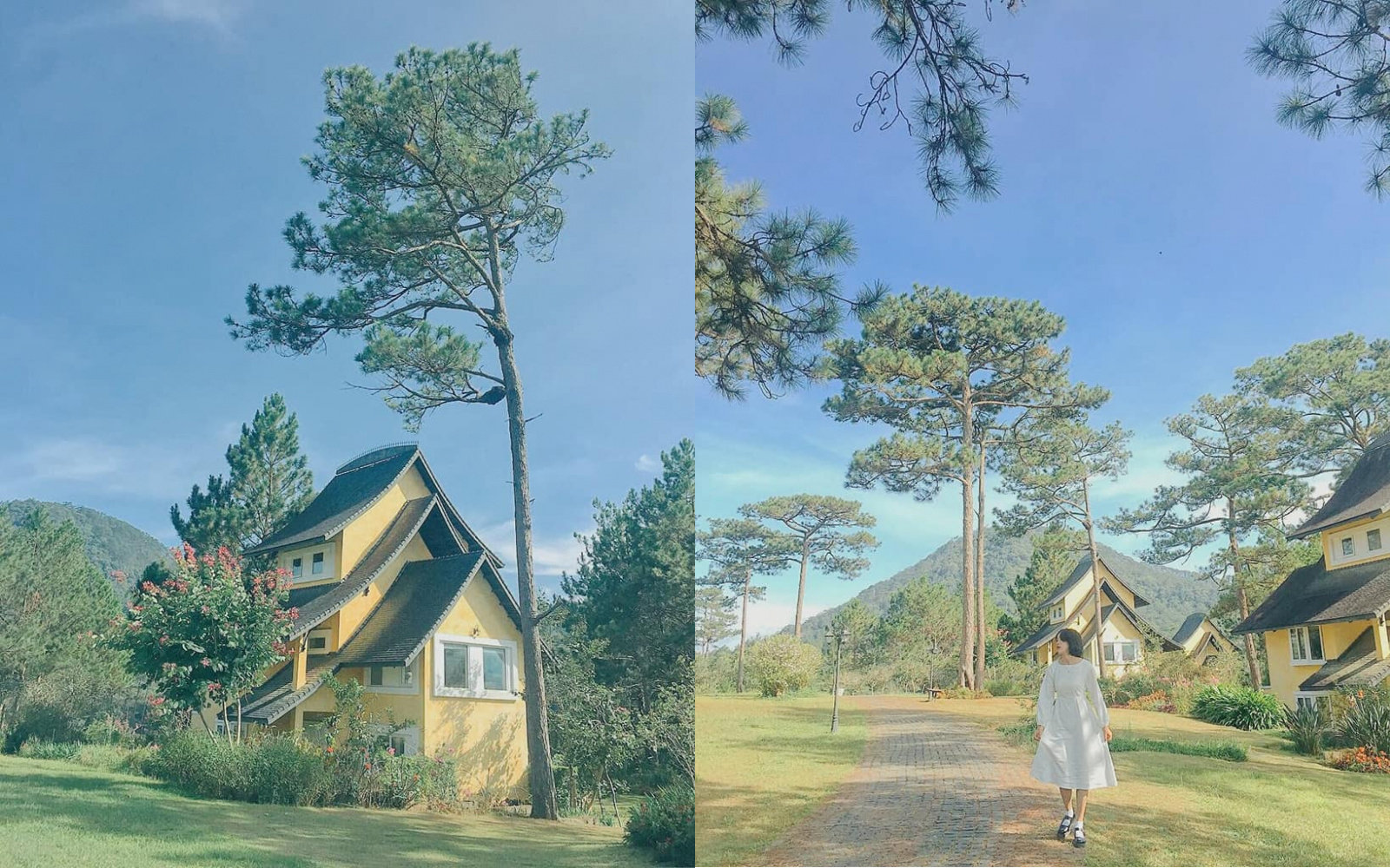 Làng Bình An là khu resort ẩn mình giữa rừng thông của hồ Tuyền Lâm, nơi những lối đi vẫn còn xanh màu dương xỉ. Ngôi làng đẹp tựa cổ tích với kiến trúc mái rất đặc trưng lấy cảm hứng từ thiết kế nhà truyền thống ở Tây Nguyên.