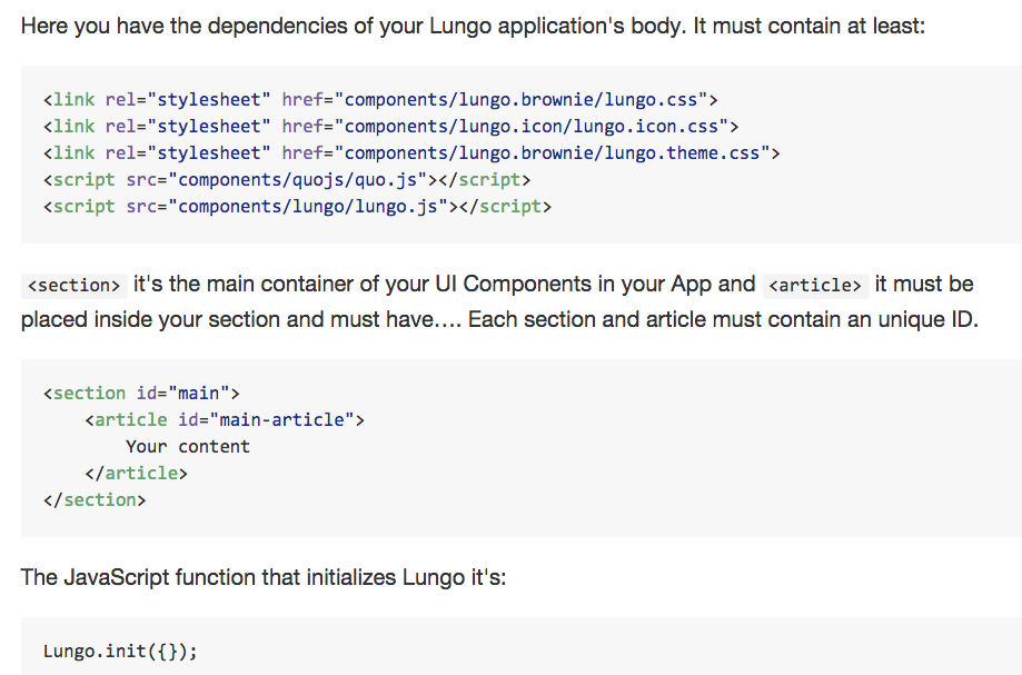 </script>Lungo is a framework for developing cross-platform applications in HTML5. Lungo applications are run in the browser, similar to other HTML-based frameworks such as jQuery Mobile. Lungo provides 2 main workflows: