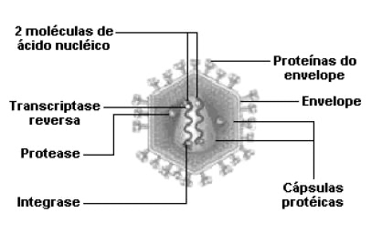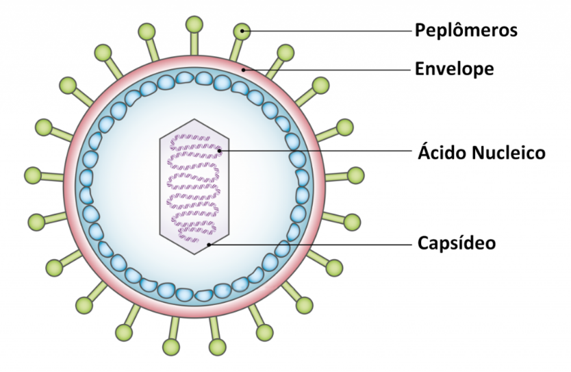 A sua estrutura é formada, basicamente, por material genético envolto por uma camada proteica. Em muitos casos, é comum, ainda, a existência de um envelope membranoso e lipídico ao redor dessa cápsula.