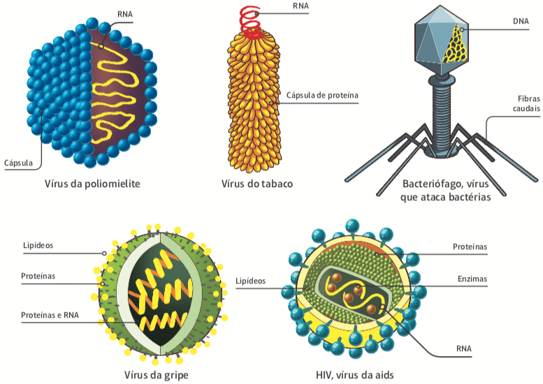 Vírus são pequenos agentes infecciosos destituídos de células que apresentam genoma constituído de uma ou várias moléculas de ácido nucleico (DNA ou RNA).