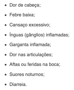 Em algumas pessoas os primeiros sinais e sintomas surgem algumas semanas após a infecção pelo vírus e são semelhantes aos da gripe, podendo desaparecer espontaneamente.