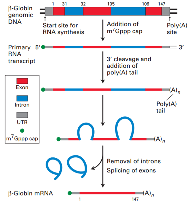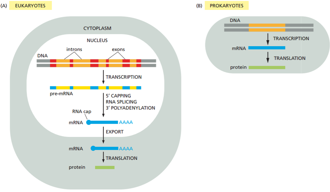 Splicing: remoção dos introns e junção dos exons. Ocorre somente em eucariotos, uma vez que procariotos não possuem introns em seus genes.