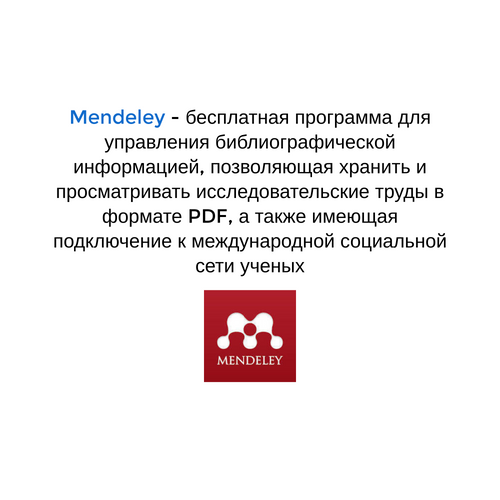 Mendeley — бесплатная программа для управления библиографической информацией, позволяющая хранить и просматривать исследовательские труды в формате PDF, а также имеющая подключение к международной соц