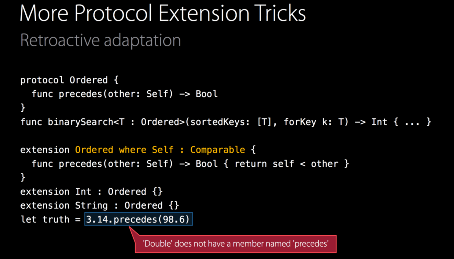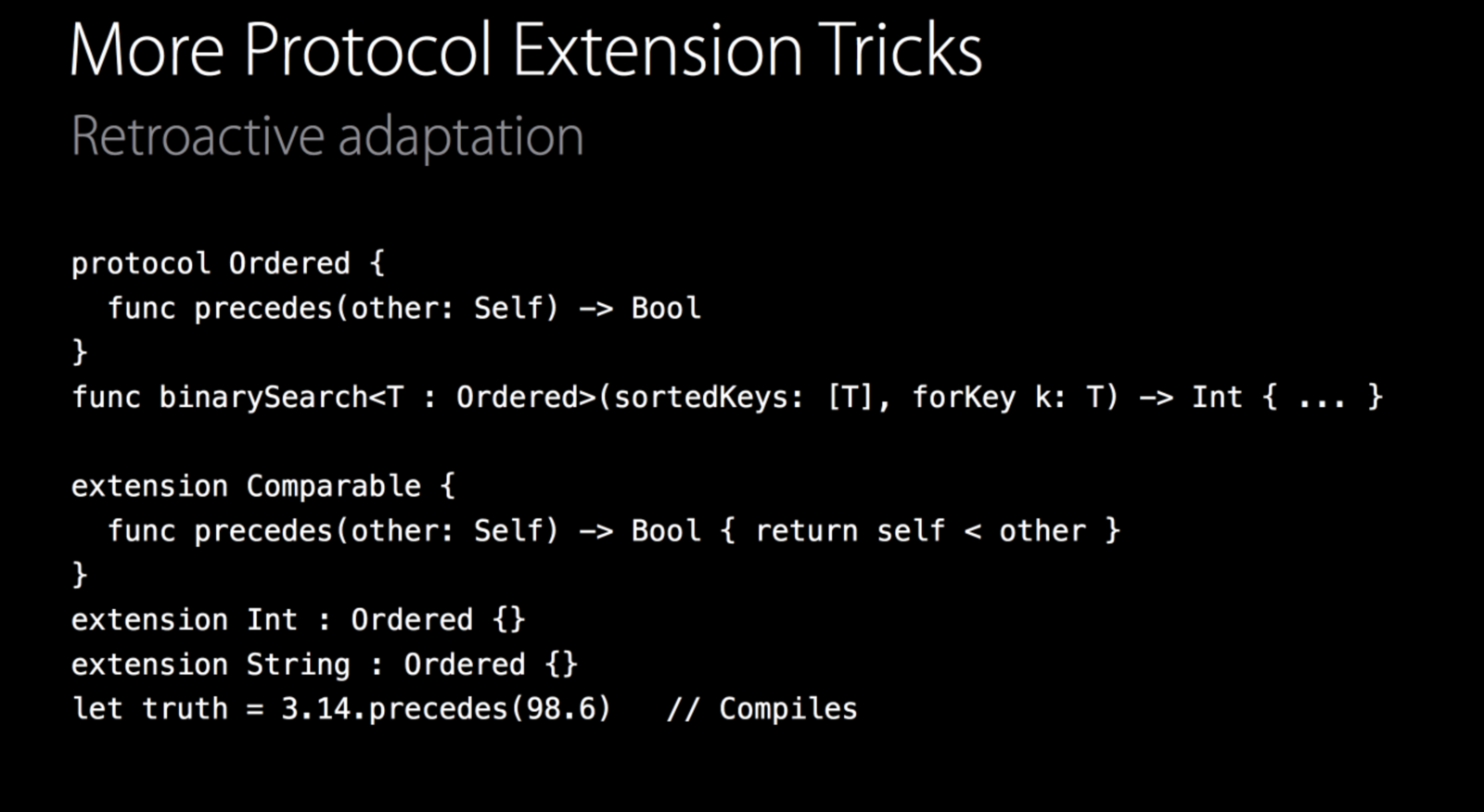 - "When you organise things by protocol, you organise them by what they're able to do, not what they are. And protocol extensions lets you do this in a way you couldn't before."