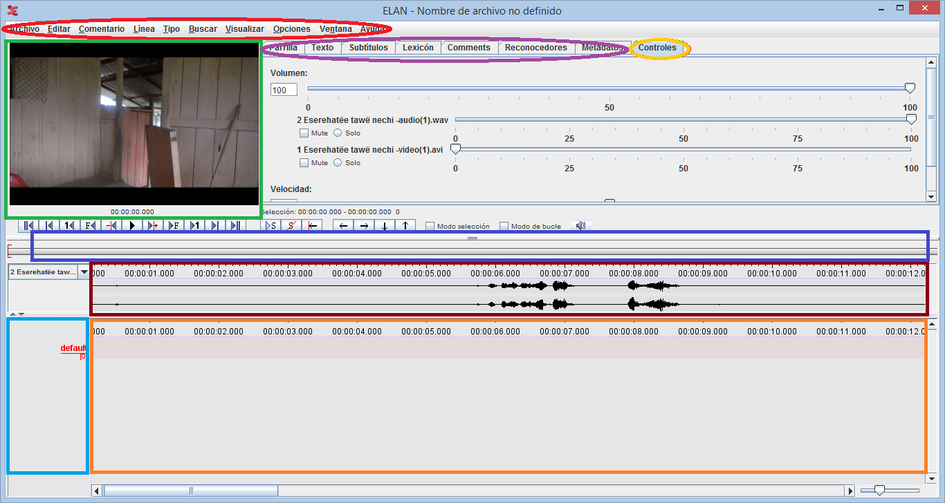 1. Barra de Menú; 2. Reconocedores y visualizadores; 3. Controles media; 4. Ventana de video; 5. Densidad de anotación; 6. Visor de la forma de onda; 7. Líneas; 8. Visor del control temporal.