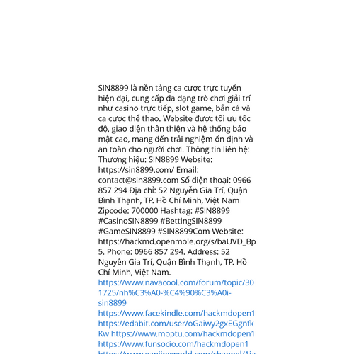 Website: https://hackmd.openmole.org/s/baUVD_Bp5https://hackmd.openmole.org/s/baUVD_Bp5 SIN8899 là nền tảng ca cược trực tuyến hiện đại, cung cấp đa dạng trò chơi giải trí như casino trực tiếp, slot game, bắn cá và ca cược thể thao. Website được tối ưu tốc độ, giao diện thân thiện và hệ