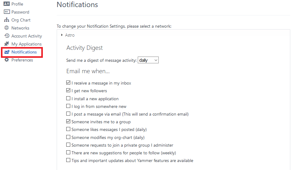 If you are popular (oh you Yammer superstar), you might want to modify your Notifications settings to save yourself from the annoyance of getting too many notification emails.