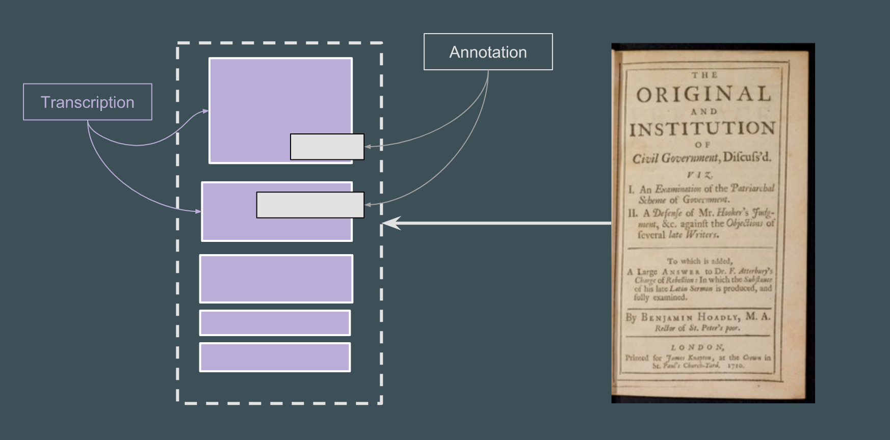 For example, commentary might be rendered alongside the image in a viewer, not superimposed on top of it, but transcription could be superimposed directly in a layer that can be toggled on and off.