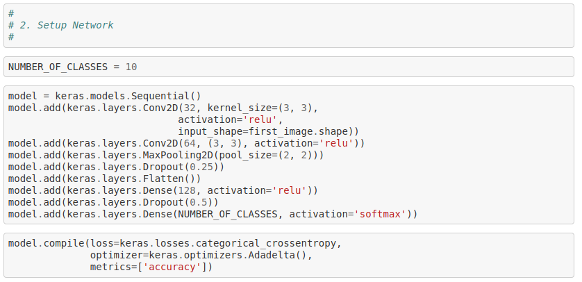 model.add(keras.layers.Dense(NUMBER_OF_CLASSES, activation='softmax'))model.compile(loss=keras.losses.categorical_crossentropy,