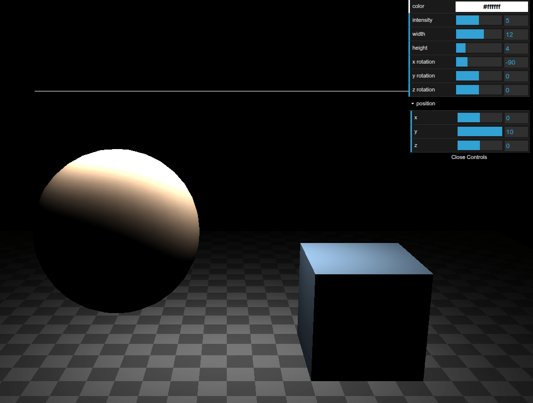 var light = new THREE.RectAreaLight(color, intensity, width, height);