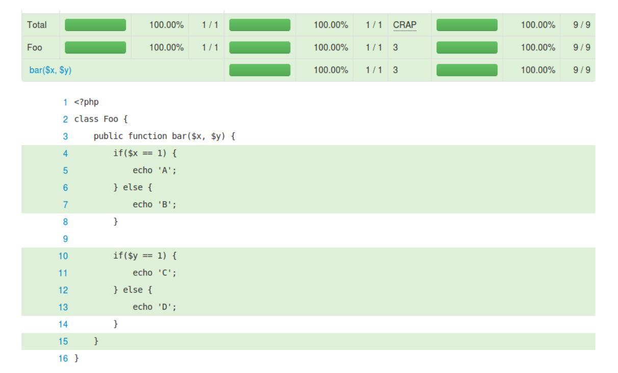 <?php class Foo { public function bar($x, $y) { if($x == 1) { echo 'A'; } else { echo 'B'; } if($y == 1) { echo 'C'; } else { echo 'D'; } } }