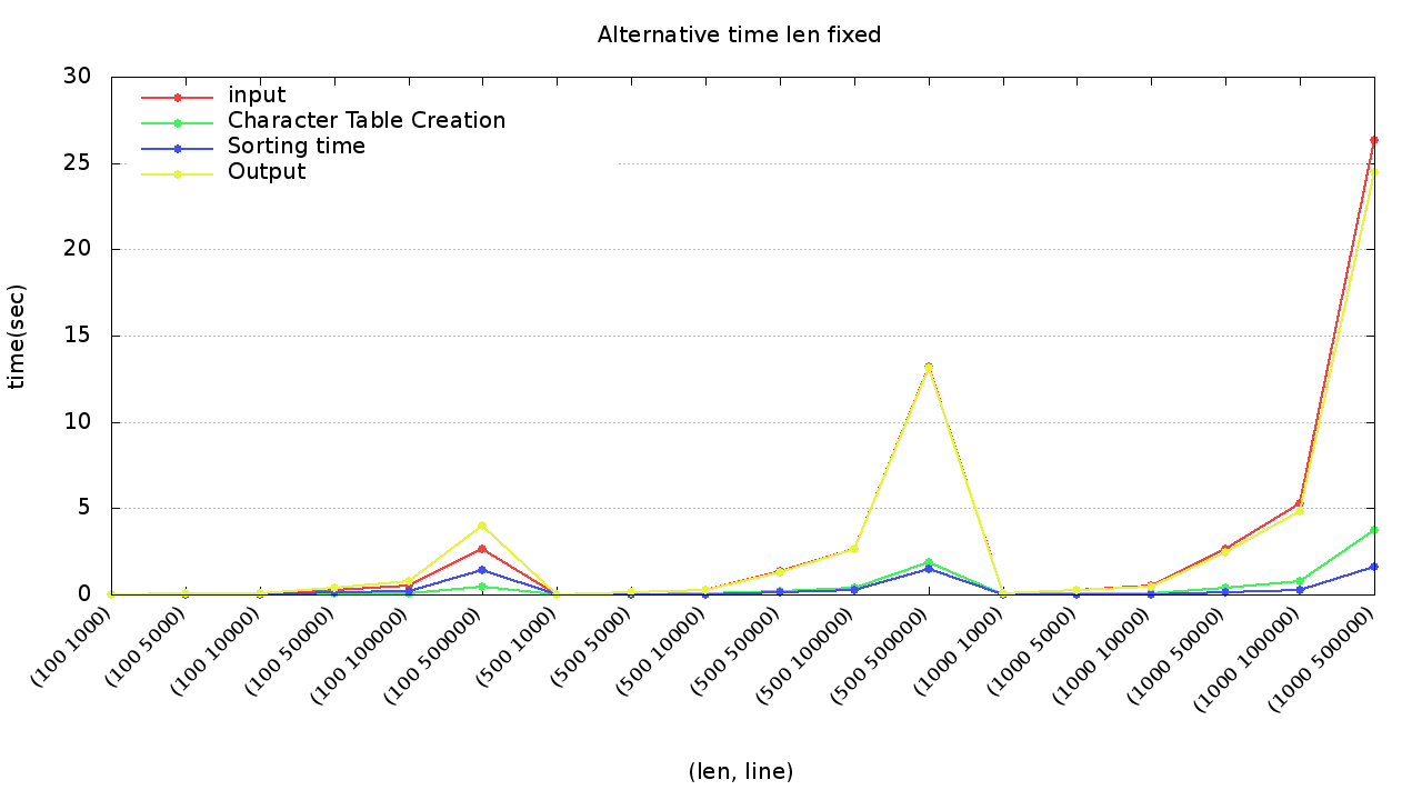- 這邊觀察到(100,500000), (500,500000), (1000,500000),這三個部分來說,雖然字串長度差距只有約1000。input卻明顯多了差距到10秒,但output可能只有3秒不到,而sorting完全沒什麼動靜