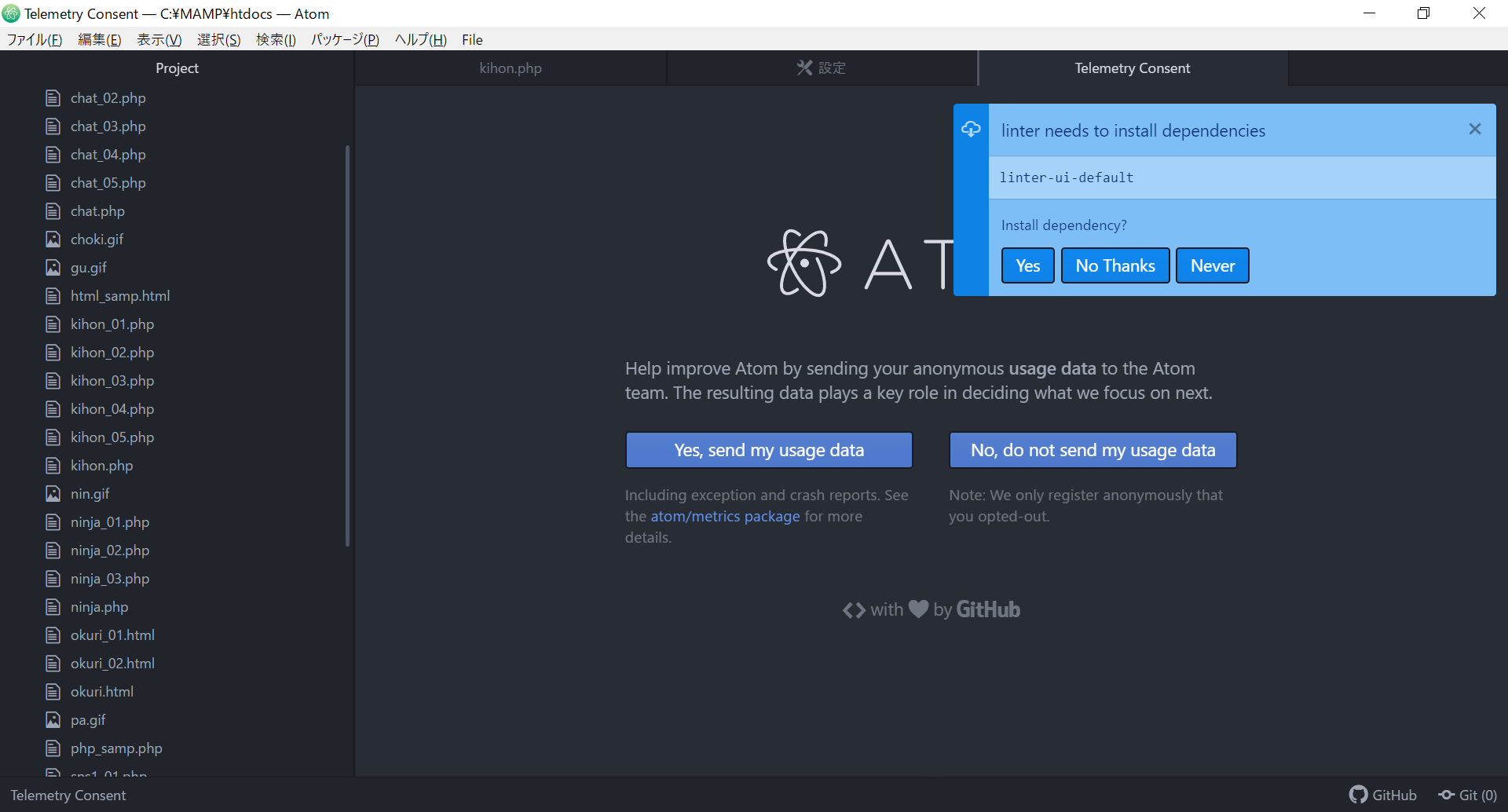 正しくインストールされるともう一つ出るので「Yes」を選択する。「linter-ui-default needs to install dependencies intentions, busy-signal Install dependencies?」「linter-ui-defaultは依存関係をインストールする必要があります 意図、ビジー信号 依存関係をインストールしますか?」