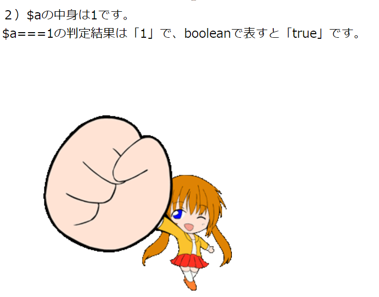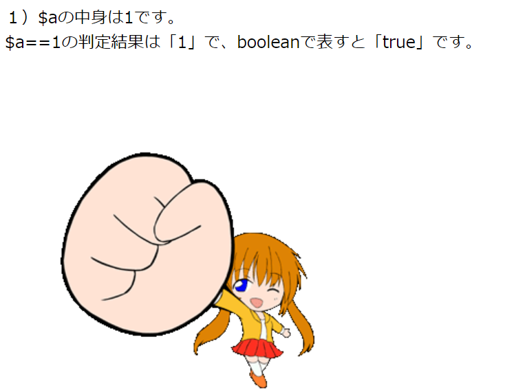 print '$a===1の判定結果は「'.$flg.'」で、booleanで表すと「'.var_export($flg,true)."」です。<br>";