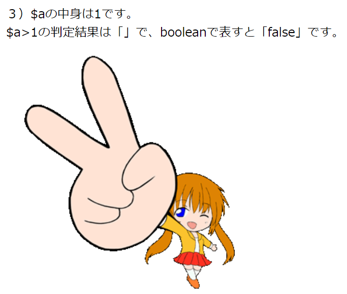 print '$a>1の判定結果は「'.$flg.'」で、booleanで表すと「'.var_export($flg,true)."」です。<br>";