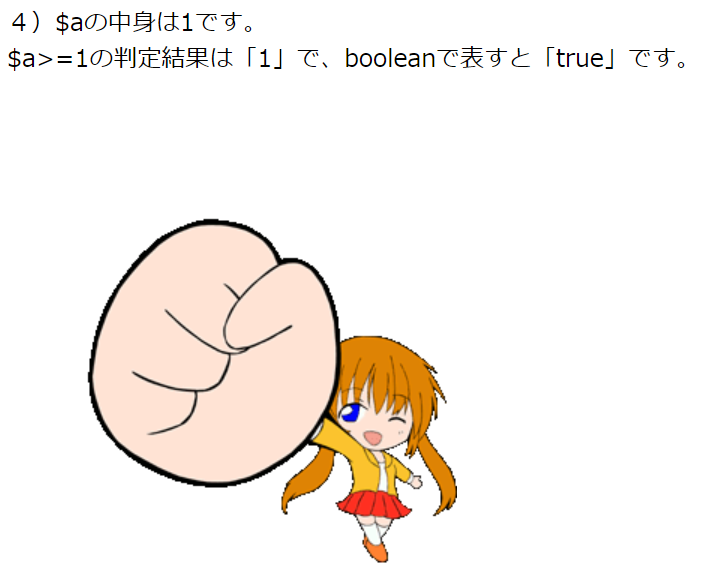 print '$a>=1の判定結果は「'.$flg.'」で、booleanで表すと「'.var_export($flg,true)."」です。<br>";