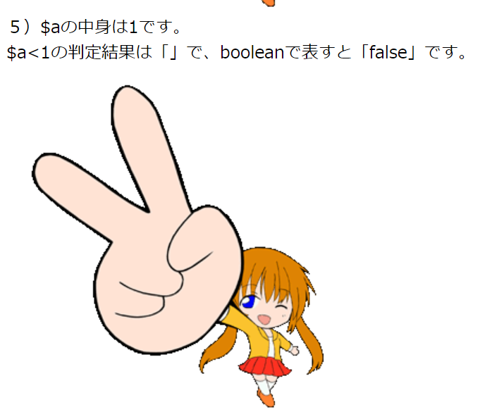 print '$a<1の判定結果は「'.$flg.'」で、booleanで表すと「'.var_export($flg,true)."」です。<br>";
