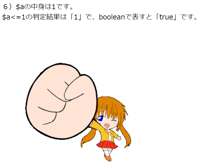 print '$a<=1の判定結果は「'.$flg.'」で、booleanで表すと「'.var_export($flg,true)."」です。<br>";