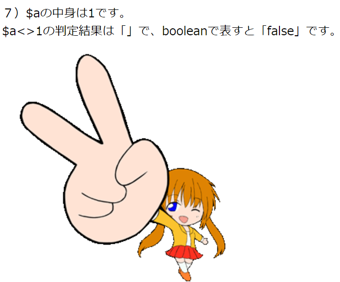 print '$a<>1の判定結果は「'.$flg.'」で、booleanで表すと「'.var_export($flg,true)."」です。<br>";