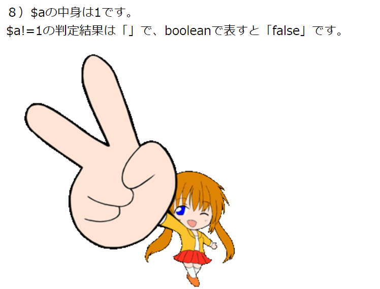 print '$a!=1の判定結果は「'.$flg.'」で、booleanで表すと「'.var_export($flg,true)."」です。<br>";