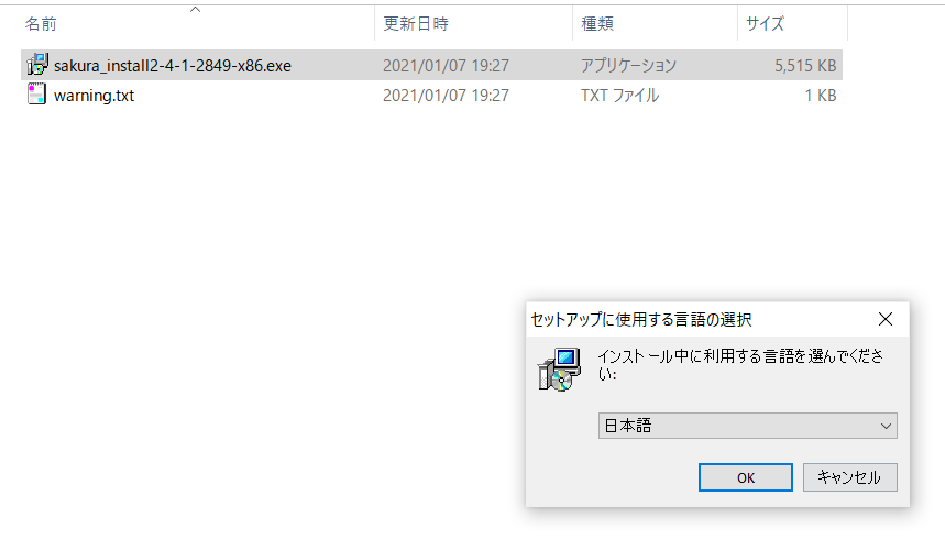 ダウンロードした「zip」を解凍すると「exe」ファイルがあるのでダブルクリックする。「日本語」を選択し「OK」を押下