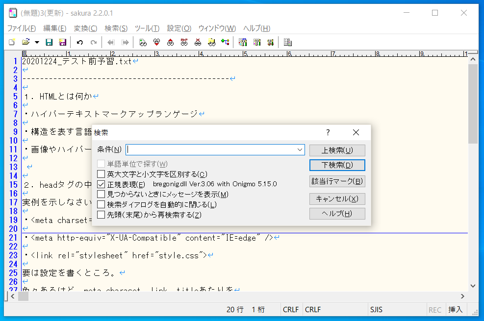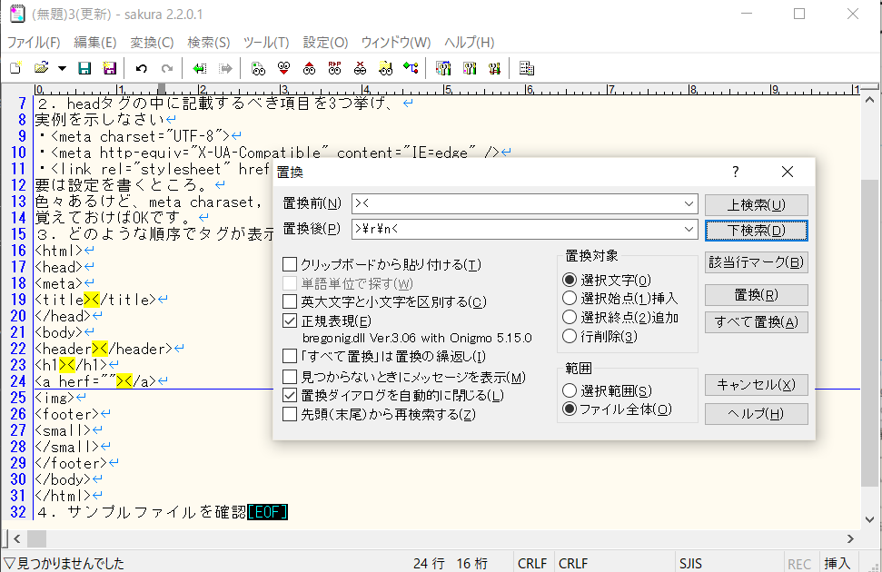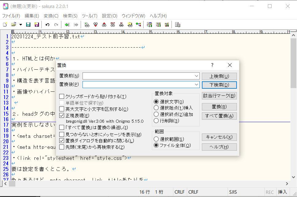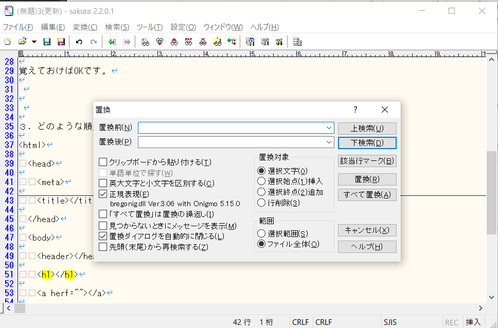 正規表現は主に文字検索、文字置換で使用する。様々な条件で文字を操作できる。「Ctrl + R」で置換小画面を表示させ、「正規表現」のチェックがONであることを確認。
